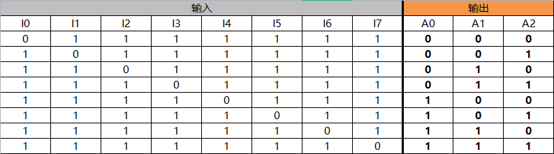 - 由真值表可看出,输出为反码形式,比如7对应!I_7,且7的二进制应为