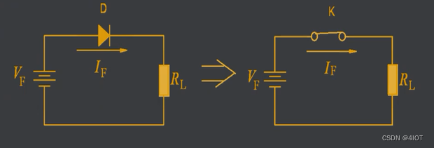 - 加正向电压VF时,二极管导通,管压降VD可忽略。二极管相当于一个闭合的开关。