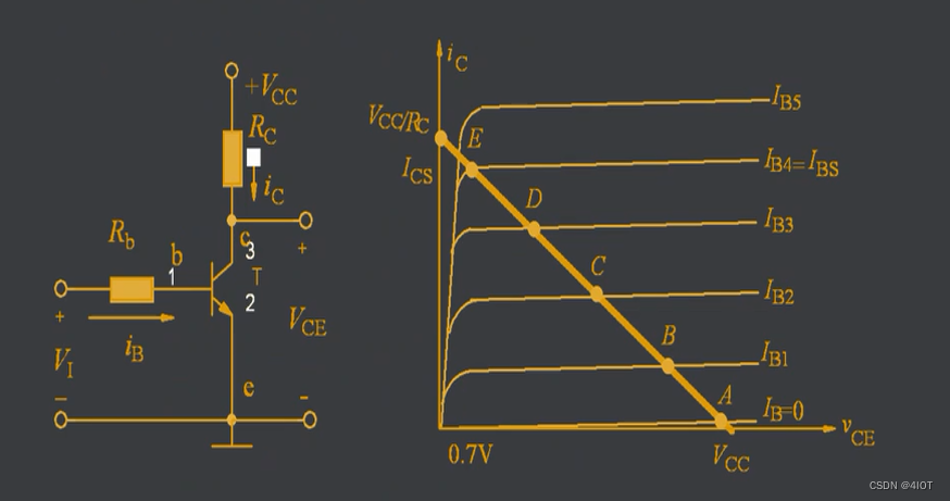 当VI小于三极管发射结死区电压时,基极电流IB=ICBO≈0,集电极电流IC=ICBO≈0,VCE≈VCC,三极管工作在截止区,对应图中的A点。