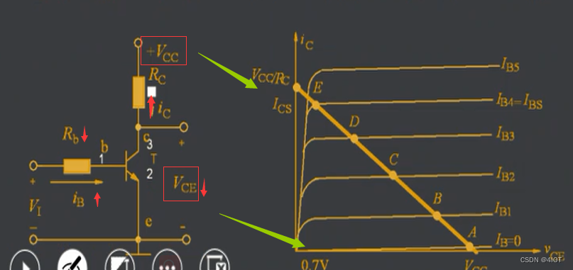 此时,若调节Rb↓,则IB↑,IC↑,VCE↓,工作点沿着负载线由A点→B点→C点→D点向上移动。在此期间,三极管工作在放大区,其特点为IC=β*IB。