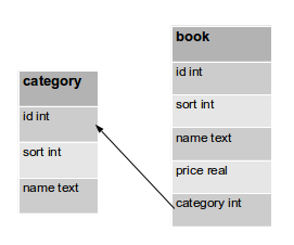 我将创建一个简单的关系型数据库,为一个书店存储书的分类和价格。数据库中包含两个表:category用于记录分类,book用于记录某个书的信息。一本书归属于某一个分类,因此book有一个外键(foreign key),指向catogory表的主键id。