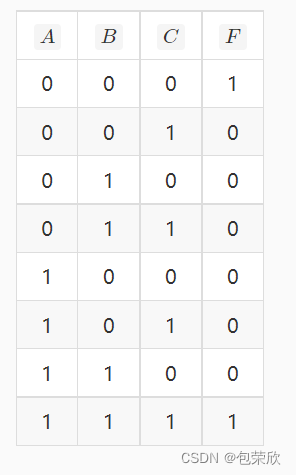 根据题中所给真值表我们可以得出F=ABC+^A^B^C ,故其逻辑电路为: