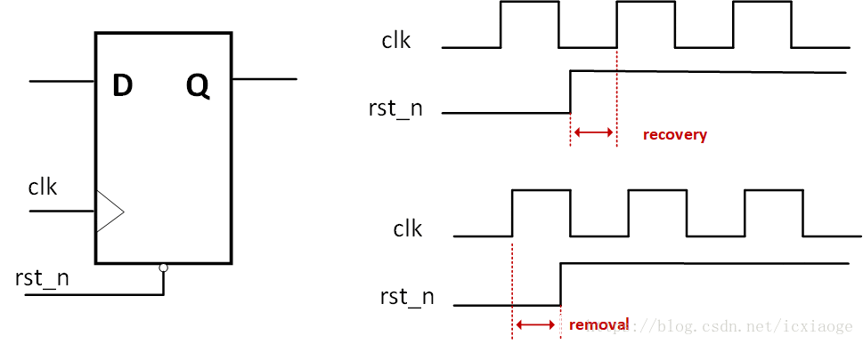 复位时,在时钟有效沿来临之后复位信号还需要保持复位状态的一段时间为去除时间removal time(去除时间)。类似同步时钟hold time。