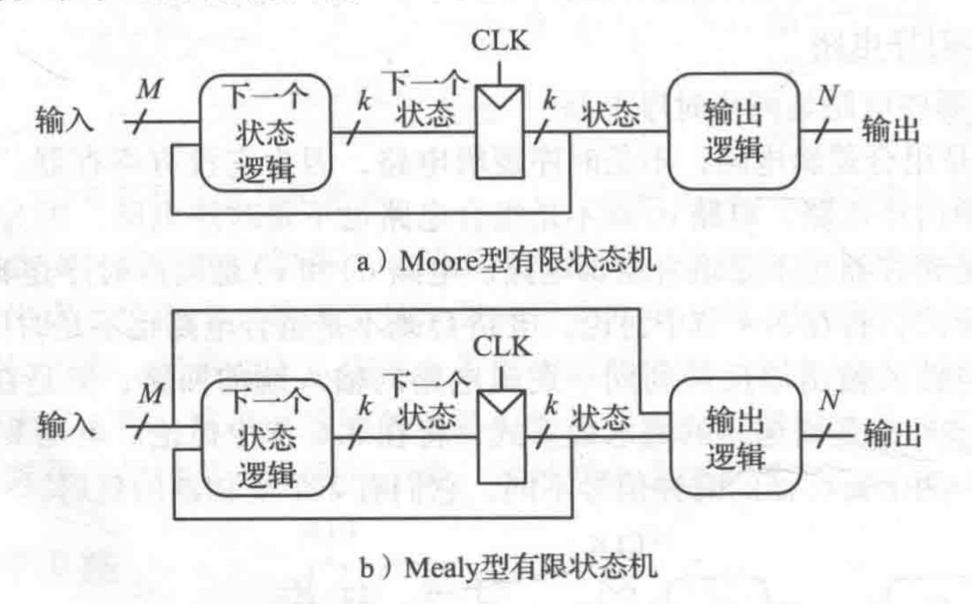 在Moore型有限状态机中,输出取决于当前状态;在Mealy型有限状态机中,输出取决于当前状态和当前输入。