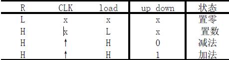本实验就是设计一个4位二进制加减法计数器,该计数器可以通过一个控制信号决定计数器时加计数还是减计数,另外,该寄存器还有一个清零输入,低电平有效。还有一个load装载数据的信号输入,用于预置数据;还有一个C的输出,用于计数器的级联。其功能表如表1.1所示;