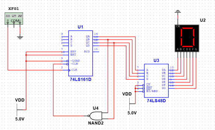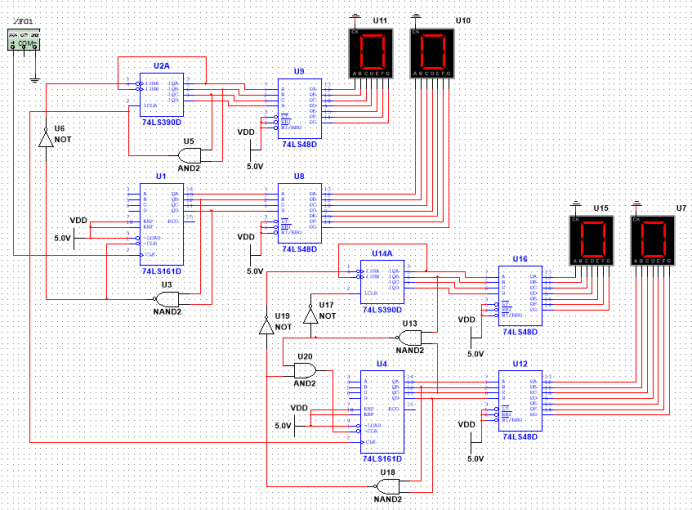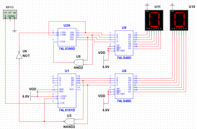 答:我这里的个位是由74HC161输出,十位是由74HC390输出。清零的方式都是反馈清零法,而进位信号使用的是用一个与非门(U3)和非门(U6)构成的,如下图所示: