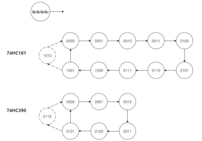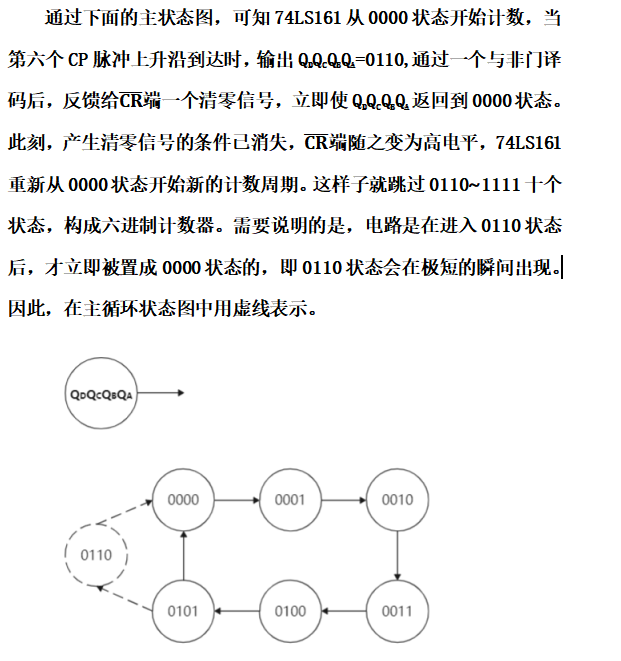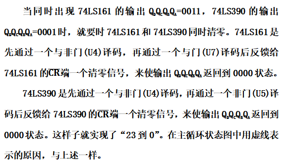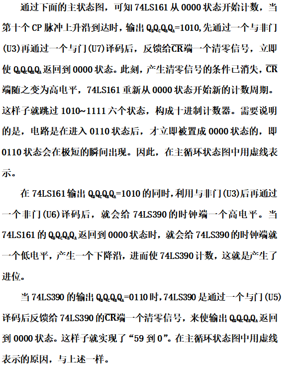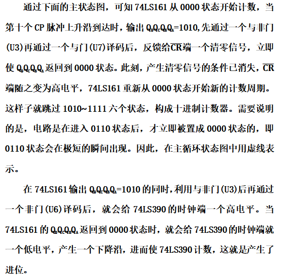 M>N时,可以利用反馈清零法和反馈置数法来跳过多余的状态。反馈清零法适用于有清零输入端的集成计数器。在本次实验使用的74LS161和74LS390都具有异步清零功能,在其计数过程中,不管它的输出处于哪一个状态,只要异步清零输入端有效,其输出会立即从那个状态回到0000状态。反馈置数法适用于具有预置数功能的集成计数器。在本次实验使用的74LS161都具有同步预置功能,在其计数过程中,使预置控制端有效时,在下一个CP脉冲作用后,计数器就会把预置数据输入端的状态置入计数器。