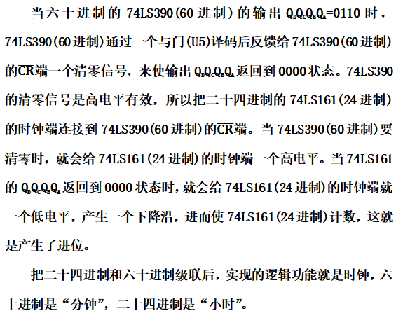 答:在本次实验中,进位信号的产生是利用清零信号的变化来实现的。如搭设二十四进制计数器时:在74LS161输出QDQCQBQA=1010的同时,利用与非门(U3)后再通过一个非门(U6)译码后,就会给74LS390的时钟端一个高电平。当74LS161的QDQCQBQA返回到0000状态时,就会给74LS390的时钟端就一个低电平,产生一个下降沿,进而使74LS390计数,这就是产生了进位。