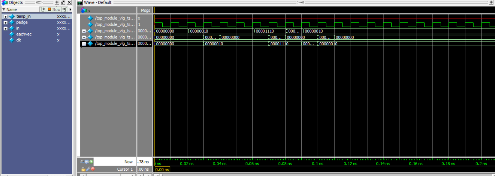 从题目的图上来看,input in[7:0]的0-1变化是和clk上升沿同步,但其实图上表达的是,in[7:0]比clk上升沿延迟一段时间从0突变为1,为验证input in[7:0]和clk同步和不同步时输出的波形,做了仿真