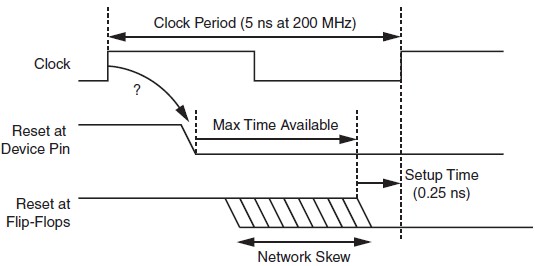 随着时钟信号频率的增高和器件规模增大带来的潜在的时钟偏移,在同一个时钟边沿对所有的触发器进行是否已经几乎是不可能的了。图3显示了高时钟频率下的复位时序图。