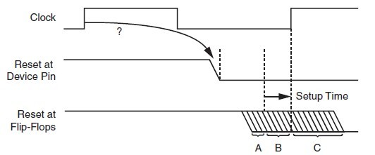 在这些情况下,复位信号的变化与FGPA芯片内部信号相比看起来是及其缓慢的,例如,复位按钮产生的复位信号的周期至少是在毫秒级别的,而我们FPGA内部信号往往是纳米或者微秒级别的。复位信号的频率是如此之低,以至于我们任务它不属于关键时序(not timing-critical)。即使是对此类信号进行时序约束,约束的周期也是非常长的。全局复位脉冲的周期远大于时钟周期,所以传统意义上假设FPGA芯片中所有的触发器都能够得到有效的复位。