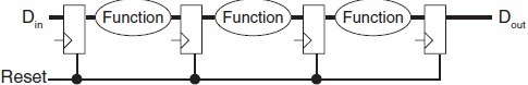 在流水线中,假如数据都是完全顺序处理的(即不存在反馈、环路等情况),则主复位信号是何时产生的是完全无关紧要的。经过几个周期的流水线操作,任何不正常的数据状态都将被从系统中“冲出”流水线,这是很容易理解的。事实上,在正常的流水线操作中,我们也很少会用到复位操作的,因为这是完全没有必要的。即使是在仿真环境中,我们也往往会在测试程序中对初始状态进行配置,从而将所有的未知状态从系统中清除出去,使得系统中的所有输入都变为有效的数据。