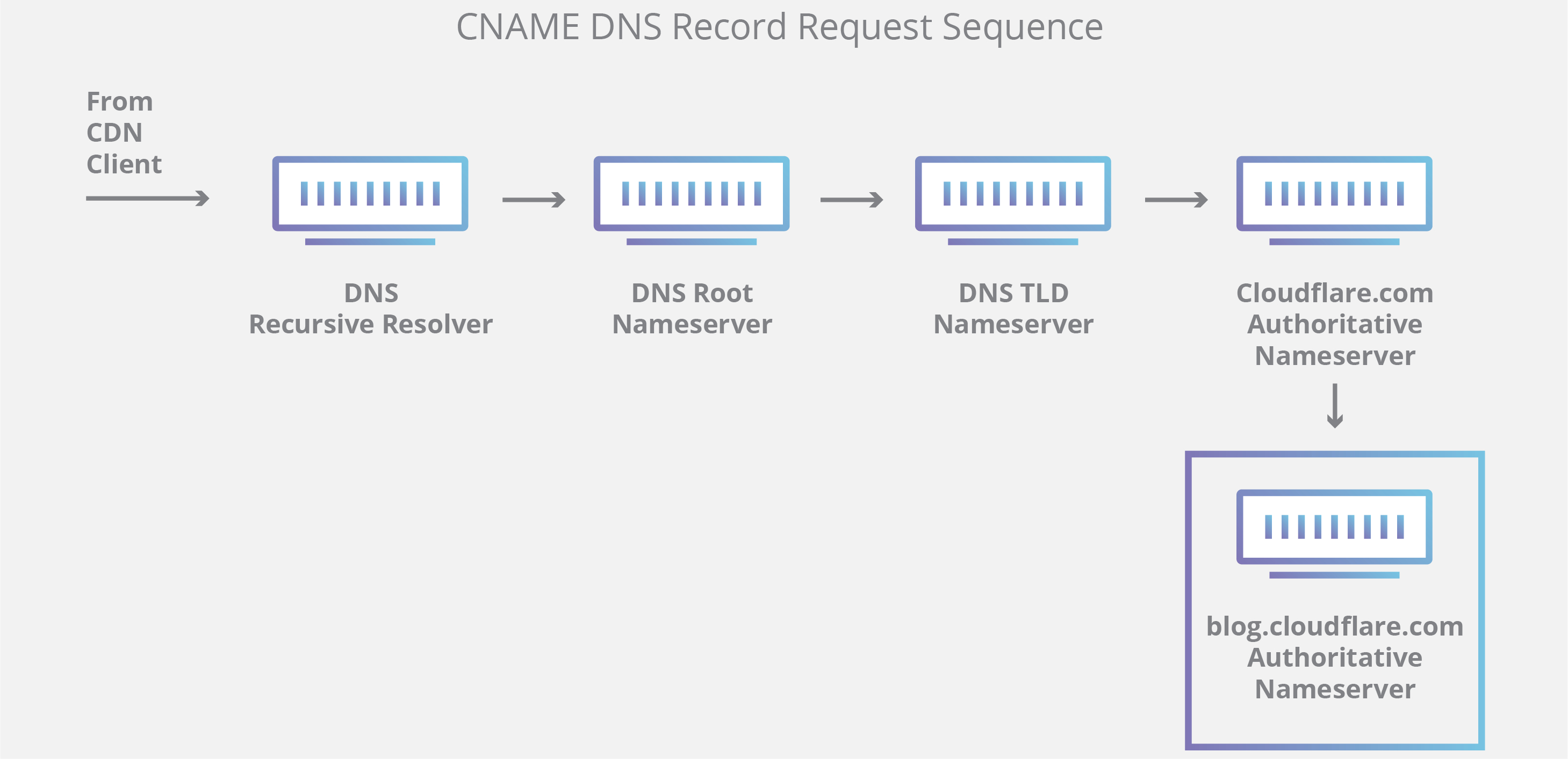 值得一提的是,在查询对象为子域(例如 foo.example.com 或 blog.cloudflare.com)的情况下,将向权威性域名服务器之后的序列添加一个附加域名服务器,其负责存储该子域的 CNAME 记录。