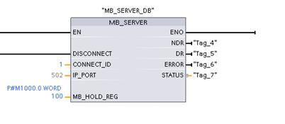 5、“MB_SERVER”指令作为ModbusTCP服务器进行通信。使用该指令,无需其它任何硬件模块,“MB_SERVER”指令将处理ModbusTCP客户端的连接请求、接收ModbusTCP功能的请求并发送响应。如下图