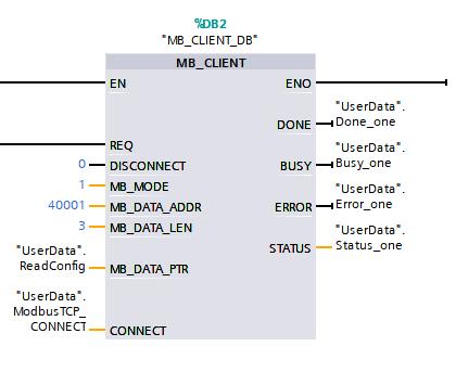 4、ModbusTCP协议通过“MB_CLIENT”指令作为ModbusTCP客户端通过进行通信,使用该指令,无需其它任何硬件模块。通过“MB_CLIENT”指令,可以在客户端和服务器之间建立连接、发送请求、接收响应并控制ModbusTCP服务器的连接终端。如下图: