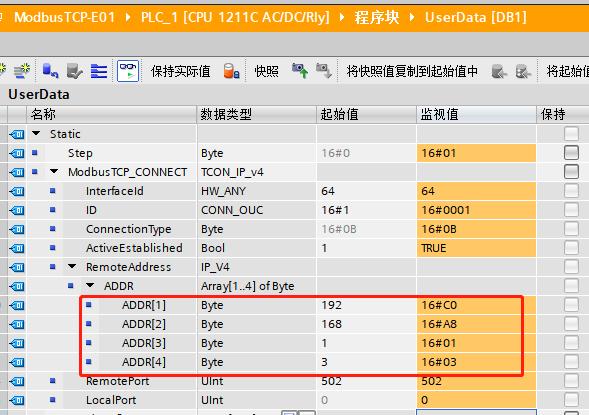 2、将此IP地址填入编程软件DB程序块的“MB_CLIEBT”的背景数据块“ADDR”中,如下图: