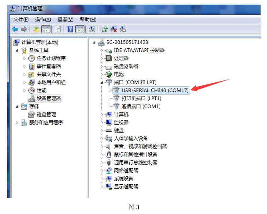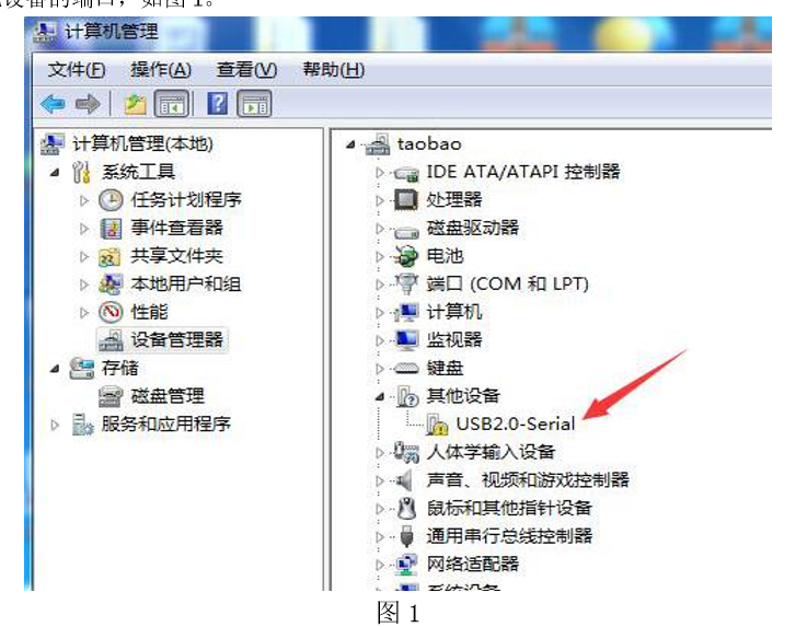 2. 请从我司网站下载驱动 CH341SER 到电脑,在桌面右键“我的电脑”,点击“管理”,选择设备管 理器,查看此设备的端口,如图 1。