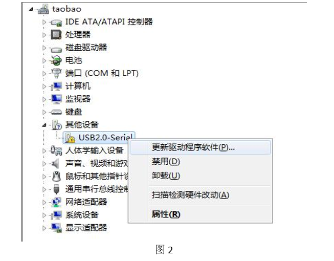 3. 右键选择此端口,如图 2,点击“更新驱动程序软件”,在显示的页面中选择“浏览计算机以查找 驱动程序软件”,选择我们的驱动文件,点确认安装。