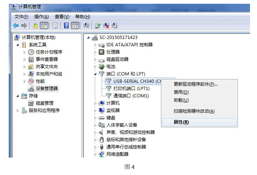 5.此设备的软件支持COM1~COM4,点击右键选择“属性”,如图 4。