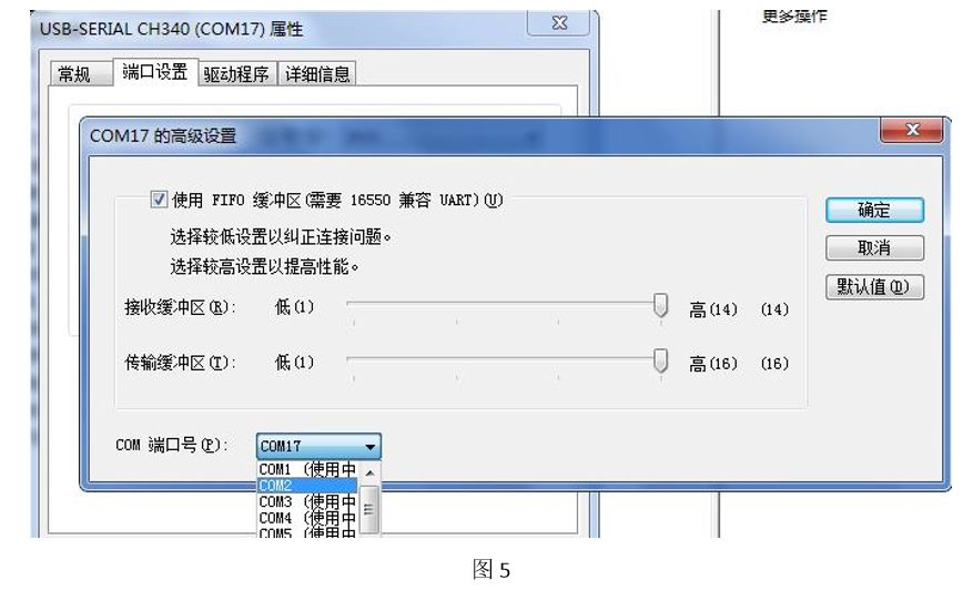 6. 在端口设置中点击“高级”,然后在页面中更改端口号,如图 5,COM1~COM4 均可,然后点确定, 更改完成。