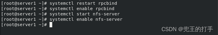 第五步:启动和启用NFS服务,同时这里注意在启用NFS服务之前,需要先使用RPC(Remote procedure call,远程过程调用)将NFS服务端的ip以及端口号发送给客户端。因此要同时启用rpcbind服务程序,并将这两个服务一起加入开机启动项中。注意这里是在NFS服务器上。