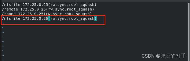 首先我们进入NFS服务器的/etc/exports文件,并在里面按照“共享目录的路径 允许访问的NFS客户端(共享权限参数)”的格式编写,注意客户端ip与权限间是没有空格的!!!
