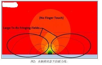 图2显示了未触摸状态下的磁力线示意图。在没有手指触碰的情况下,Tx-Rx磁力线占据了盖板内相当大的空间。边缘磁力线投射到电极结构之外,因此,术语“投射式电容”由之而来。