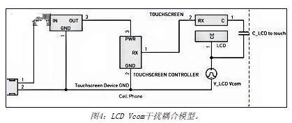 便携式设备触摸屏可以直接安装到LCD显示屏上。在典型的LCD架构中,液晶材料由透明的上下电极提供偏置。下方的多个电极决定了显示屏的多个单像素;上方的公共电极则是覆盖显示屏整个可视前端的连续平面,它偏置在电压Vcom。在典型的低压便携式设备(例如手机)中,交流Vcom电压为在直流地和3.3V之间来回震荡的方波。交流Vcom电平通常每个显示行切换一次,因此,所产生的交流Vcom频率为显示帧刷新率与行数乘积的1/2。一个典型的便携式设备的交流Vcom频率可能为15kHz。图4为LCD Vcom电压耦合到触摸屏的示意图。