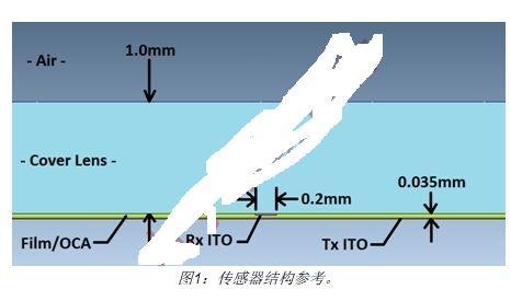 典型的投射式电容传感器安装在玻璃或塑料盖板下方。图1所示为双层式传感器的简化边视图。发射(Tx)和接收(Rx)电极连接到透明的氧化铟锡(ITO),形成交叉矩阵,每个Tx-Rx结点都有一个特征电容。Tx ITO位于Rx ITO下方,由一层聚合物薄膜或光学胶(OCA)隔开。如图所示,Tx电极的方向从左至右,Rx电极的方向从纸外指向纸内。