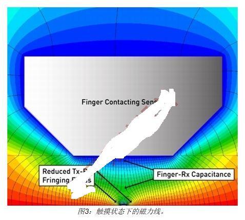 当手指触摸盖板时,Tx与手指之间形成磁力线,这些磁力线取代了大量的Tx-Rx边缘磁场,如图3所示。通过这种方式,手指触摸减少了Tx-Rx互电容。电荷测量电路识别出变化的电容(△C),从而检测到Tx-Rx结点上方的手指。通过对Tx-Rx矩阵的所有交叉点进行△C测量,便可得到整个面板的触摸分布图。