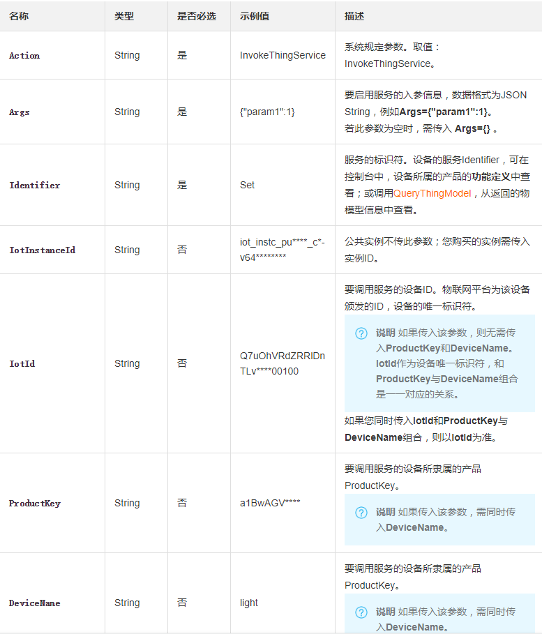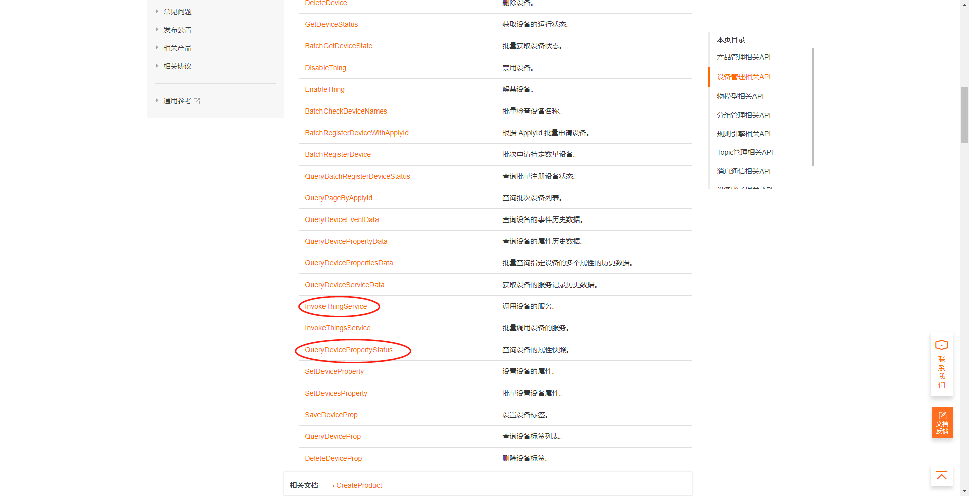 我们可以在阿里云物联网平台官方文档中查看到云端API的列表。此次示例主要使用QueryDevicePropertyStatus(获取设备属性快照)和InvokeThingService(调用设备服务)两个接口来进行演示。