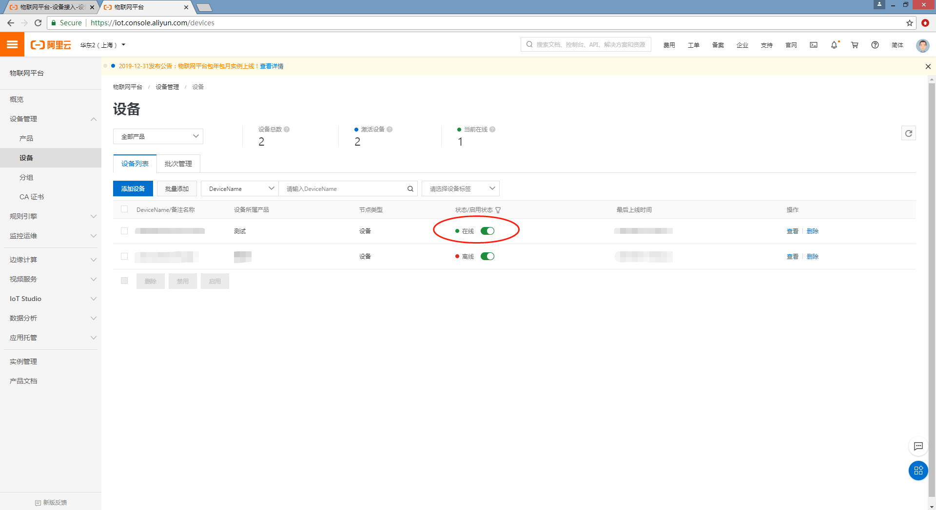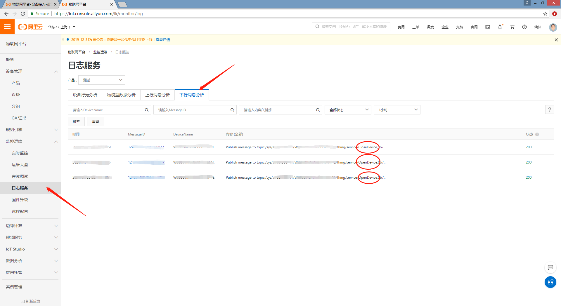 下面我们到物联网平台看一下日志是否成功调用该服务。