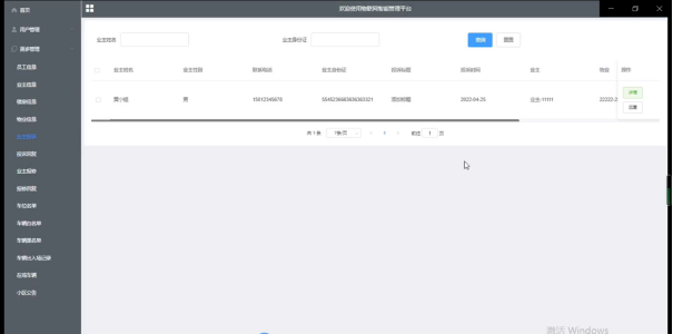 业主投诉,在业主投诉信息页面可以查看业主姓名、业主性别、联系电话、业主身份证、投诉标题、投诉时间、业主、物业等信息,如图5-6所示。