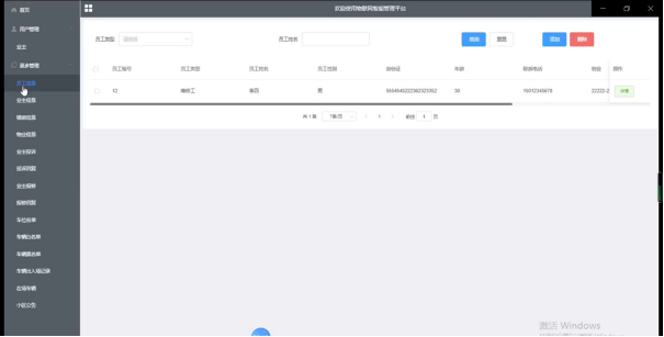 物业登录系统后台可以查看首页、员工信息、楼房信息、物业信息、业主投诉、投诉回复、业主报修、报修回复、车位名单、车辆白名单、车辆黑名单、车辆出入场登记、在场车辆、小区公告管理等,并且还可以对其进行相应的操作管理,如图5-12所示。