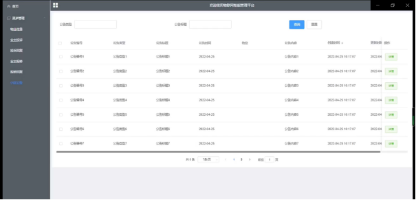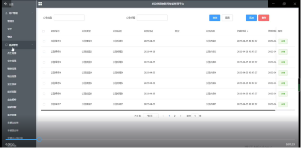 小区公告管理,在小区公告管理页面中可以查看公告编号、公告类型、公告标题、公告时间、物业、公告内容等信息,还可以根据需要进行修改或删除等详细操作如图5-8所示。