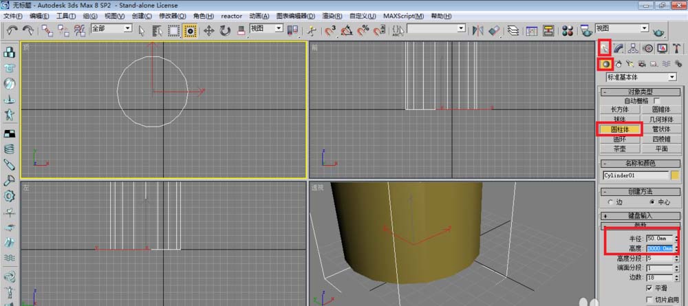 2、单击创建面板下的圆柱体,在顶视图建立一个圆柱体作为中心支柱。