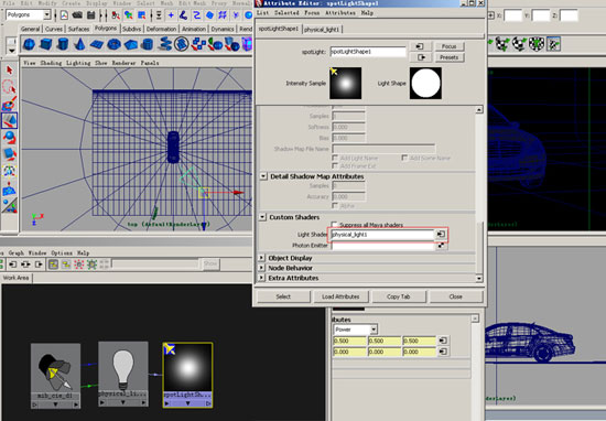 2.在light shader里添加一个physical_light节点,如果你的车是彩色的可以在这个节点之上加mib_cie_di控制色温和亮度。(老爷机step2就不用试了)如下图。