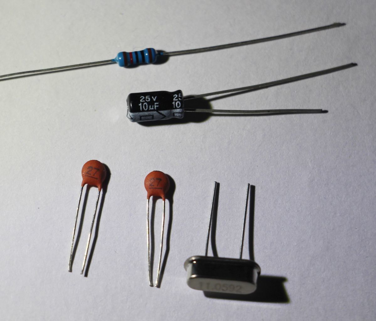 图中的元件用于复位电路和时钟电路。上面是10k色环电阻,具体读法请自行学习;然后是10uF点解电容,电解电容有正负极,图中表皮上标有白色箭头的管脚为负极,如果是如图所示全新的电解电容,正极的引脚更长;下面左边是两个瓷片电容,没找到30pF我用比较接近的27pF代替,具体容量读法也请自行学习;右下角是晶振,正面标注了11.0592,即晶振的频率为11.0592MHz。