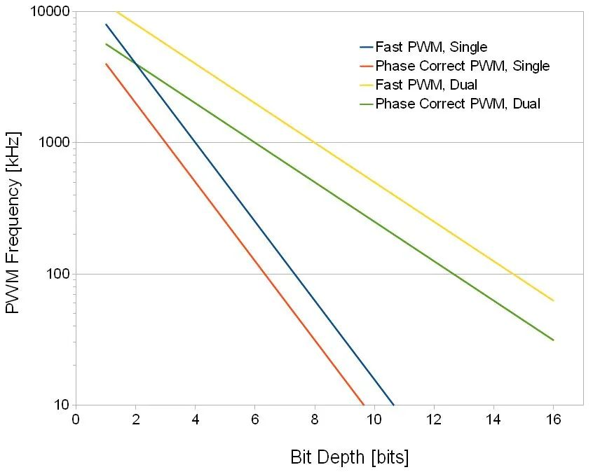 则可以看到上面的图示了,在一个周期内,其占空比决定了平均电压值,红色的线表示平均电压。对于一个周期内的数据,我们可以进行量化,其量化的方式为首先设定(0~5v)之间的电压用(0-256表示),此时就可以有8位分辨率(2^8=256)。由于每个量化点都可以表示一个电压,而电压又直接和PWM的一个周期的占空比直接相关,所以可以得到占空比和量化点的关系。同样的16位量化数据则表现的更为精确。但是如果量化的数据越大,则PWM频率越低(计数的时间变长),这是PWM的基本权衡。执行的越快,精度就越低。这里比较关键,但需要好好理解,随着PWM频率的不断提升,其占空比的选择就不再那么随意了,精度会大大的降低。