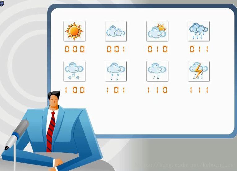 通过一个简单的例子来说明这个问题。我们知道,一个由3位二进制数字构成的码组,总共由8种不同的组合。若将其全部表示天气,则可以表示8种不同的天气,如下: