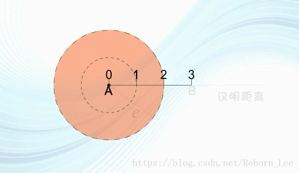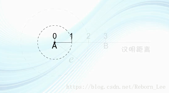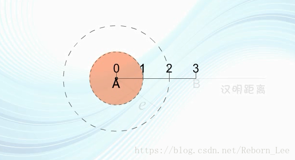 我们用下图简单说明一下,设一码组A位于0点。若码组A中发生1位错码,则可以认为A的位置将移动到以0位圆心,以1位半径的圆上某点;