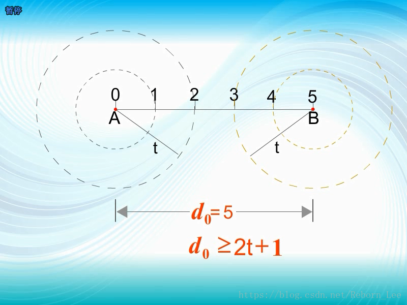 图中码组A或B若发生不多于两位错码,和它们的错码位置均不会超过以原位置为圆心,以2为半径的圆,由于这两个圆不重叠,故可以这样判决:若接收码组落在以A为圆心的圆上,就判决收到的码组为A;