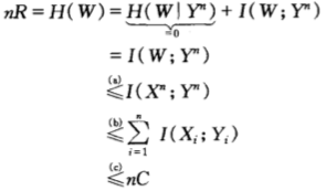上的均匀分布,于是,H(W) = nR。从而,我们有如下不等式推导过程,
