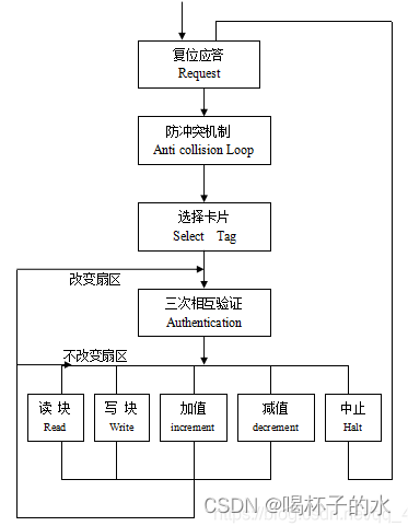防冲突机制:当有多张卡进入读写器操作范围时,防冲突机制会从其中选择一张进行操作,未选中的则处于空闲模式等待下一次选卡,该过程会返回被选卡的序列号。