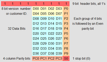 EM4100卡能够存储64bits数据,只可读不可写,其数据格式如下: