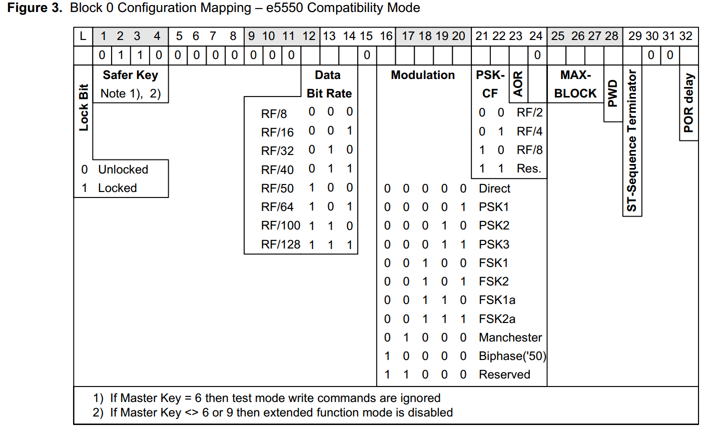 拿到白卡的第一步是配置Page0的Block0配置寄存器(Mode Register)详见Figure 3,默认值为‘00 08 80 E8’h,表示RF/32、曼彻斯特编码,无密码模式。