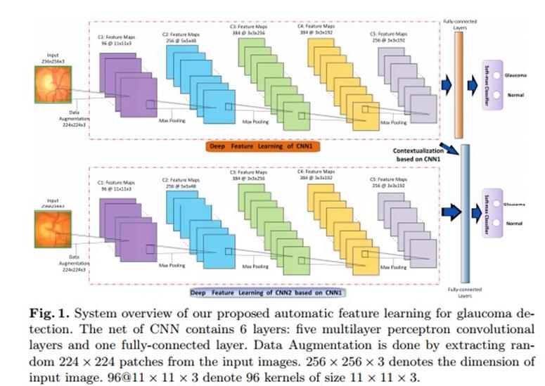 与传统的独立训练神经网络的CNN不同,本文采用contextualizing训练我们提出的DL架构,其中整个深CNN被称为contextualized卷积神经网络(C-CNN)。对于CNN训练,我们采取一个已训练的CNN的输出作为自己全连接层的context输入。这个context有责任调整CNN模型的学习,从而实现了contextualized卷积神经网络。 如图1所示,CNN2通过上述C-CNN策略训练,将CNN1的卷积层输出作为自己完全连接层的context输入。 C-CNN包括五个多层感知器卷积层CNN1和全部的CNN2网络。青光眼的预测结果来自CNN2的soft-max分类器。