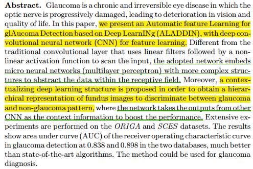 本文提出了基于DeepLearnINg的自动特征学习为青光眼检测,不同于传统的卷积神经网络,本文采用的网络嵌入了微型神经网络(多层感知器)有更复杂的结构去抽象感知区域的数据;此外提出了一种上下文深度学习结构来获得眼底图像的分层表示以区分青光眼和非青光眼模式,这里网络采用其他CNN网络的输出作为此网络的上下文特征来提升青光眼检测的性能。本文采用的方法在ARIGA和SCES数据上进行测试,同时取得了最先进的性能。