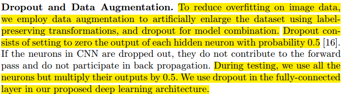 为了减少对图像数据的过度拟合,我们采用数据扩充人工放大数据集。Dropout包括将每个隐藏神经元的输出以0.5的概率设置为零[16]。在测试期间,我们使用所有的神经元,但它们的输出乘以0.5。数据扩充包括生成图像翻译和水平翻转。在训练时,我们通过在256×256图像中提取随机的224×224个图像块(包括它们的水平翻转)来执行数据增加。在测试时,CNN通过在256×256图像和翻转的图像中提取四角和中心的图像块即10个224×224个图像块,然后采用softmax层对其进行预测,最后结果做平均来实现预测。