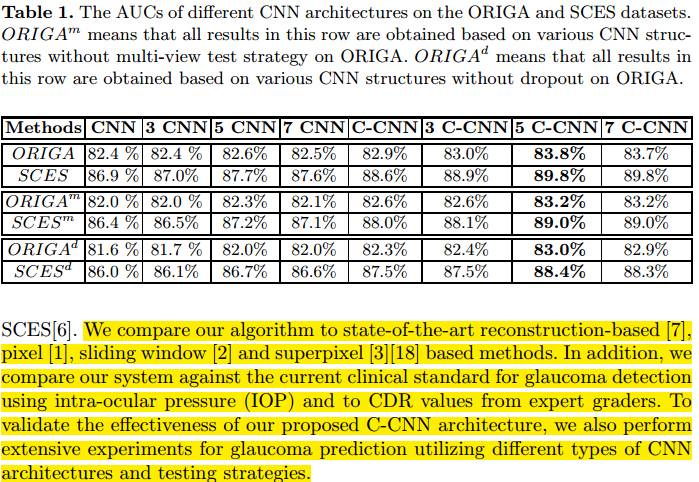 实验具体的设置和文献7中的一致,ORIGA数据集由168例青光眼和482例正常图片;SCES数据集有1676例图片,其中46例为青光眼图片。